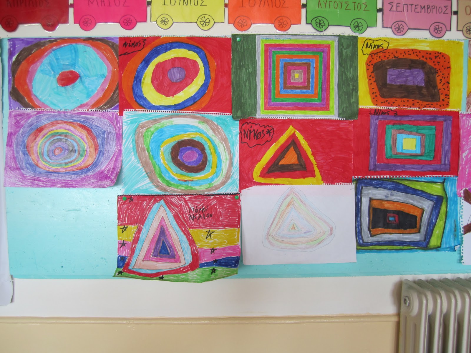 Διαδικασία: Στο κέντρο του φύλλου τους ζωγραφίζουν ένα γεωμετρικό σχήμα. Τα αφήνουμε να διαλέξουν όποιο θέλουν (τρίγωνο, τετράγωνο, παραλληλόγραμμο, κύκλος. Στη συνέχεια κάνουν ακόμα μεγαλύτερα σχήματα γύρω από το αρχικό. Στο τέλος ζωγραφίζουν (πιο όμορφο γίνεται με μαρκαδόρους) τον κάθε κύκλο με διαφορετικό χρώμα. Ζωγραφίζουν και το υπόλοιπο άσπρο χαρτί γύρω από το σχήμα τους με διαφορετικό χρώμα.